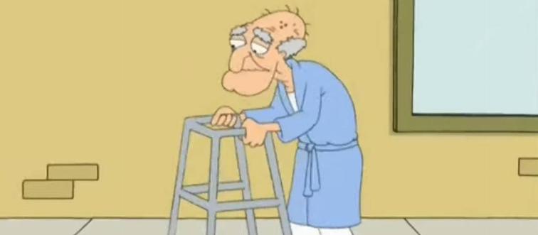 Which elderly, high-pitched, and squeaky-voiced character likes Chris?